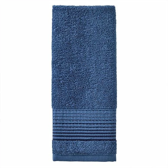 - Spot-on style. Give your bath a fun, fresh update with the Logan Bathroom Collection. Included are two hand towels. One towel is featured in solid terry with a woven weft insert and banded hem. The other towel is featured in soft cotton velour with a blue-tone dotted print.